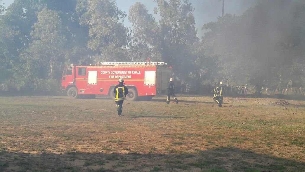 Die Feuerwehr (in den Uniformen der Neu-Ulmer Feuerwehr), von Denise alarmiert und in Diani stationiert, war zwar nach 25 Minuten zur Stelle. Dies war aber leider zu spät, um noch irgendetwas zu retten. Und was nicht bereits durch das Feuer zerstört war, fiel dem Löschwasser zum Opfer.