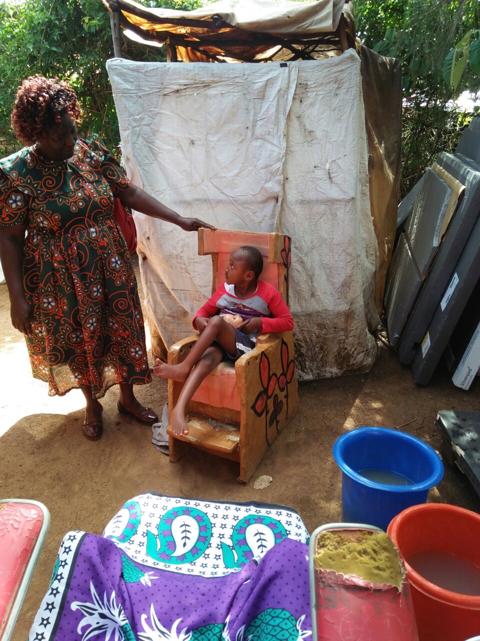 8. Januar 2018Das Kind ist dem Alter, in dem unsere Neema nun wäre. Die Mutter macht alles für ihr Kind und gibt Unmengen von Geld für die Therapie aus. Henry sah sie immer mit dem Kind auf dem Rücken und frage deshalb Gudrun, ob sie nicht einen Rollstuhl für sie hätte. Gudrun hat ihm dann den Stuhl von Neema geschickt. Die Mutter und das Kind haben sich riesig gefreut und konnten es kaum fassen, als Henry den Stuhl brachte.
