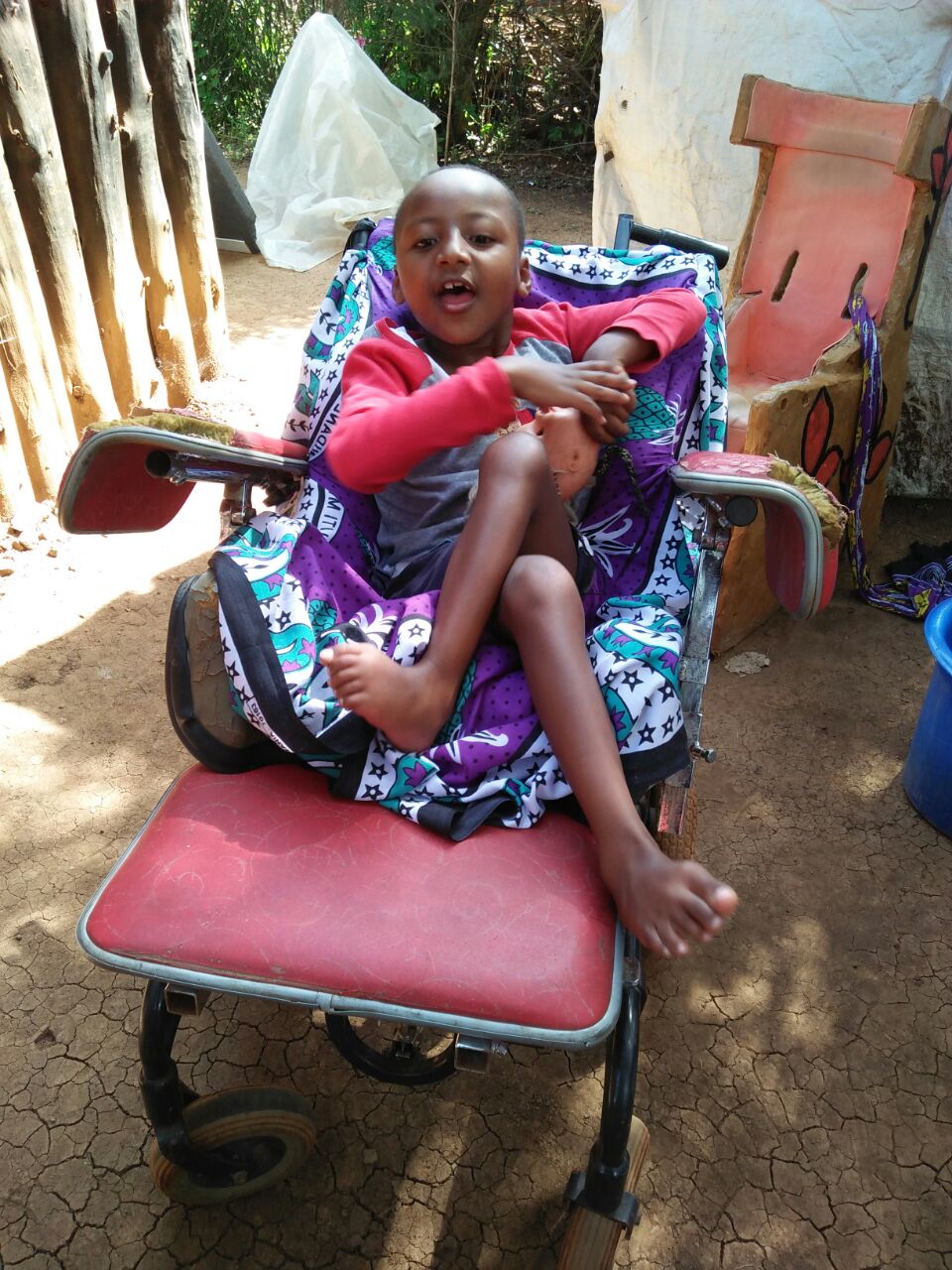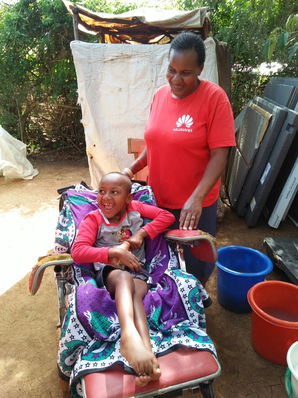Henry always saw her with the child on her back and asked Gudrun if she did not have a wheelchair for her. Gudrun then sent him the chair of Neema. The mother and the child were very happy and could hardly believe it when Henry brought the chair.