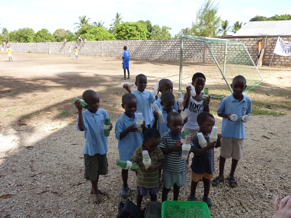 Um die Spieler gebührend anfeuern zu können wurden einen Tag vorher schon Rasseln aus Bechern und Steinen gebastelt, damit die Unterstützung deutlich zu hören ist. Ebenfalls wurde auf einem großen weißen Leinwand Tuch ein Banner erstellt für den FC NICE VIEW. Das Motto lautete *Keep on fighting till the End*, kämpft bis zum Schluss !