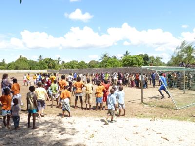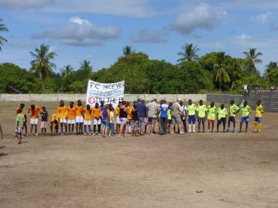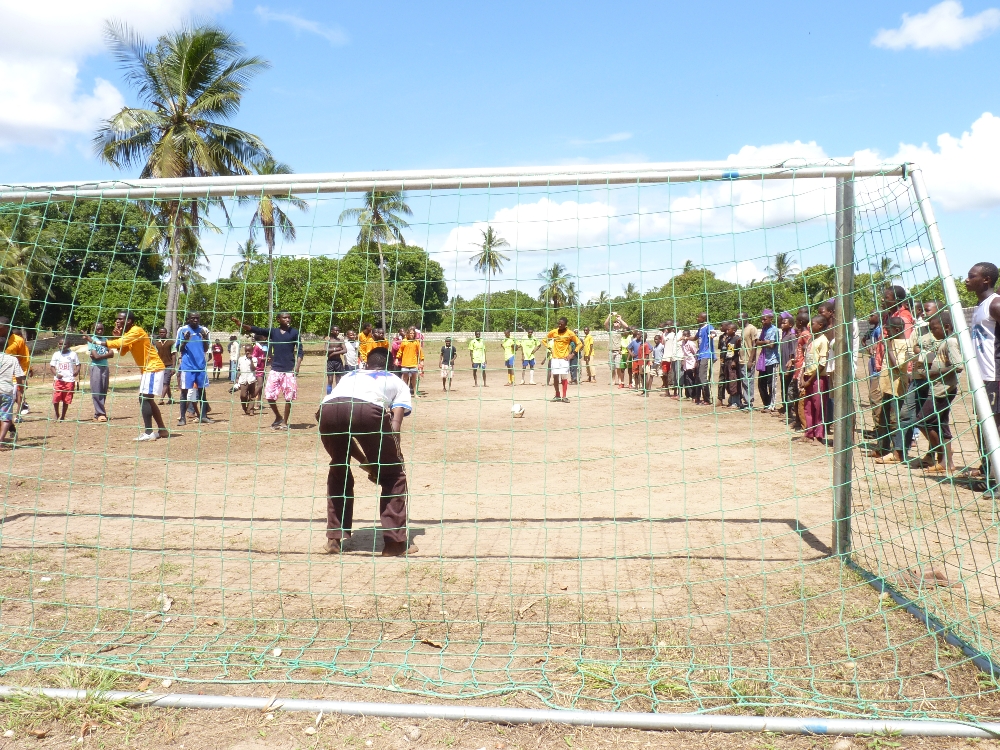 Um 08.30 Uhr wurde dann das große Finalspiel auf dem NICE VIEW Sportgelände angepfiffen. Ringsum überall Zuschauer. Die Gäste saßen im Schatten der Bäume sowie auf der Mauer, die um das Gelände gebaut ist. Und natürlich nicht zu vergessen, all die Kinder von NICE VIEW sind einheitlich in Ihrer Schuluniform vor Ort um Ihr Team zu unterstützen. Die Fußballteams haben sich aufgestellt und der Schiedsrichter pfeift in Flip Flops das Spiel an. Jetzt ging’s los. Das Team in Nice View deutlich erkennbar an den gelben Fußballtrikots, sowie das Gegner Team setzten sich in Bewegung. Die Trikots der Gegner sind leider noch nicht am Sportplatz angekommen, aber auf dem Weg dorthin. Doch für langes Warten sei nun keine Zeit. Denn wer barfuß ohne Schuhe Fußball spielen kann, benötigt auch nicht zwingend ein Trikot.