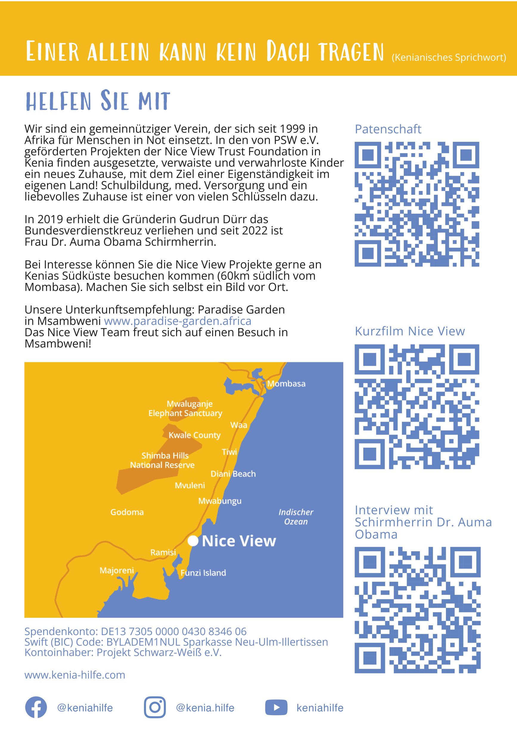 Die Mitglieder im Verein Projekt Schwarz-Weiß e.V. und das gesamte Team in Nice View unter der großartigen Führung von Gudrun Dürr schauen mit Stolz auf das Erreichte. Aber uns allen ist bewusst, dass diese nachhaltige Hilfe, die nun schon seit 23 Jahren geleistet wird, ohne die vielen Spender und Sponsoren unmöglich wäre.