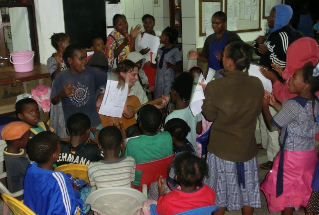 Liedwünsche und knackige Rhythmen der Nice-View Kids – gute Aussichten für einen Gitarrenkurs, der jetzt dann startet. (mit Dank an die Heimat für die tollen Gitarren, die hier vor kurzem aus Deutschland ankamen).