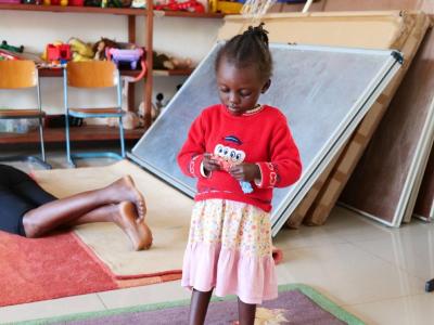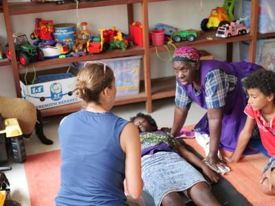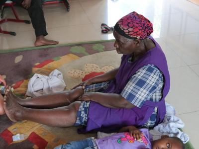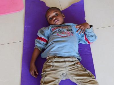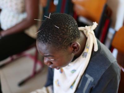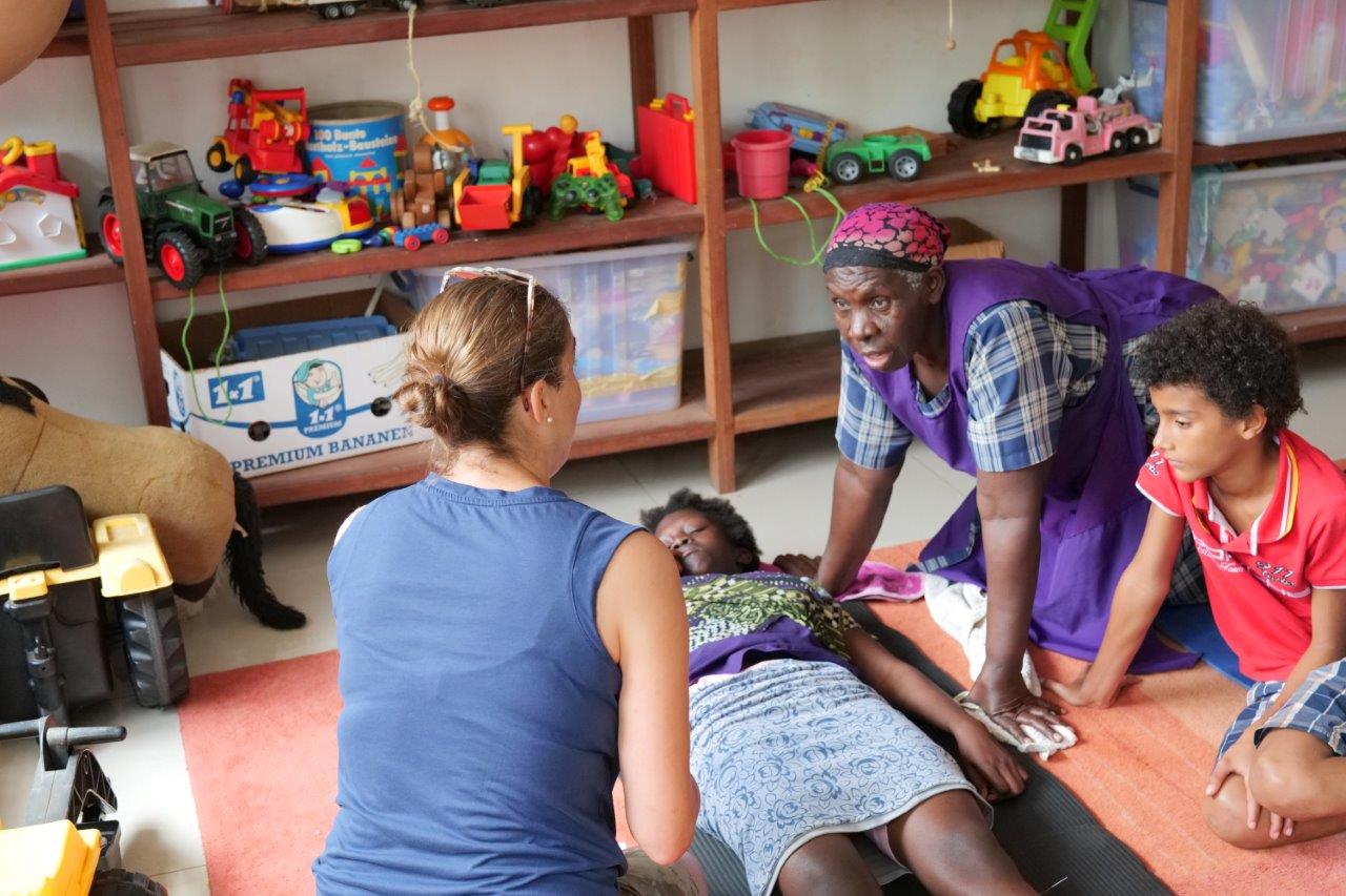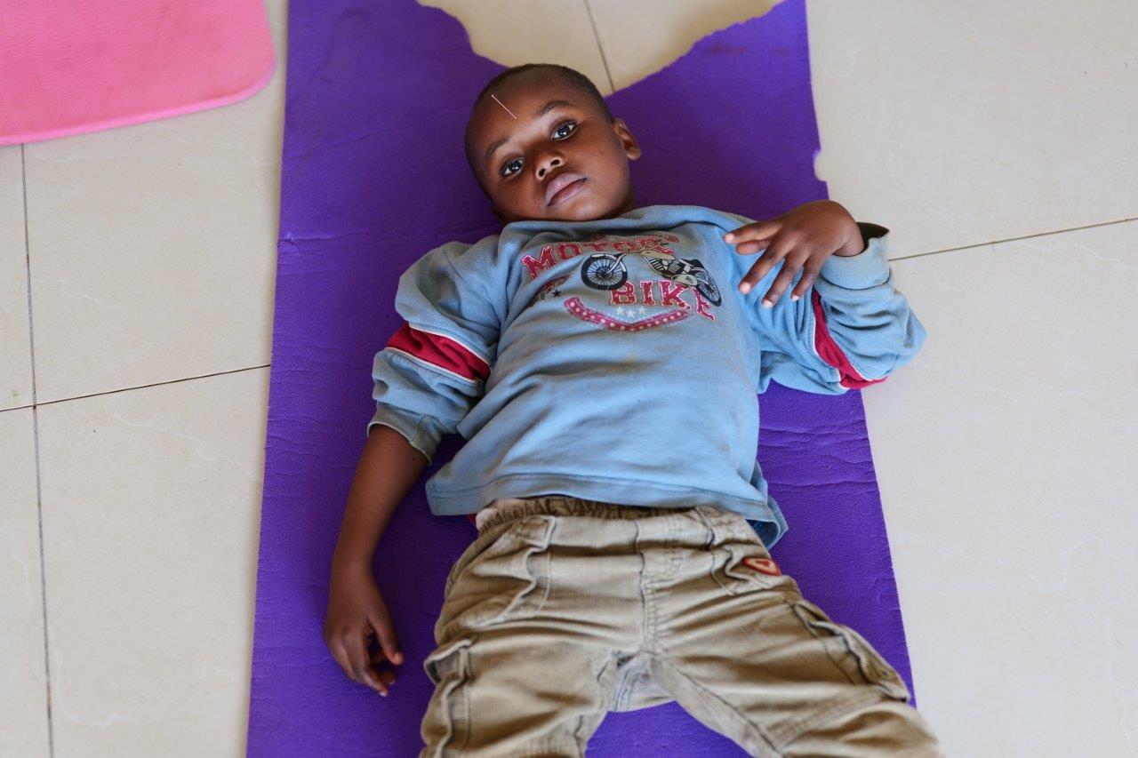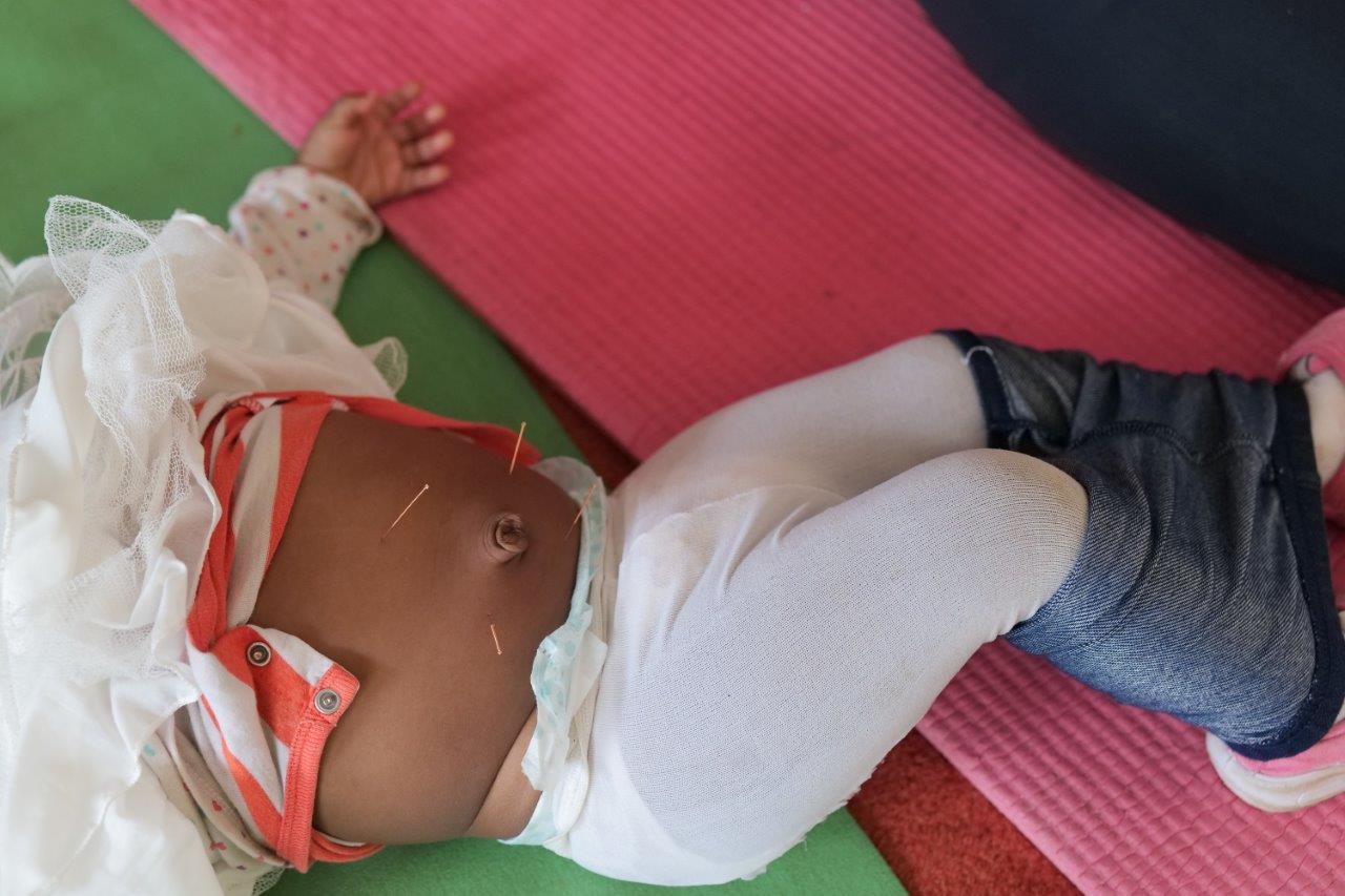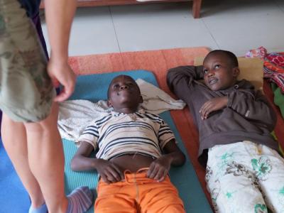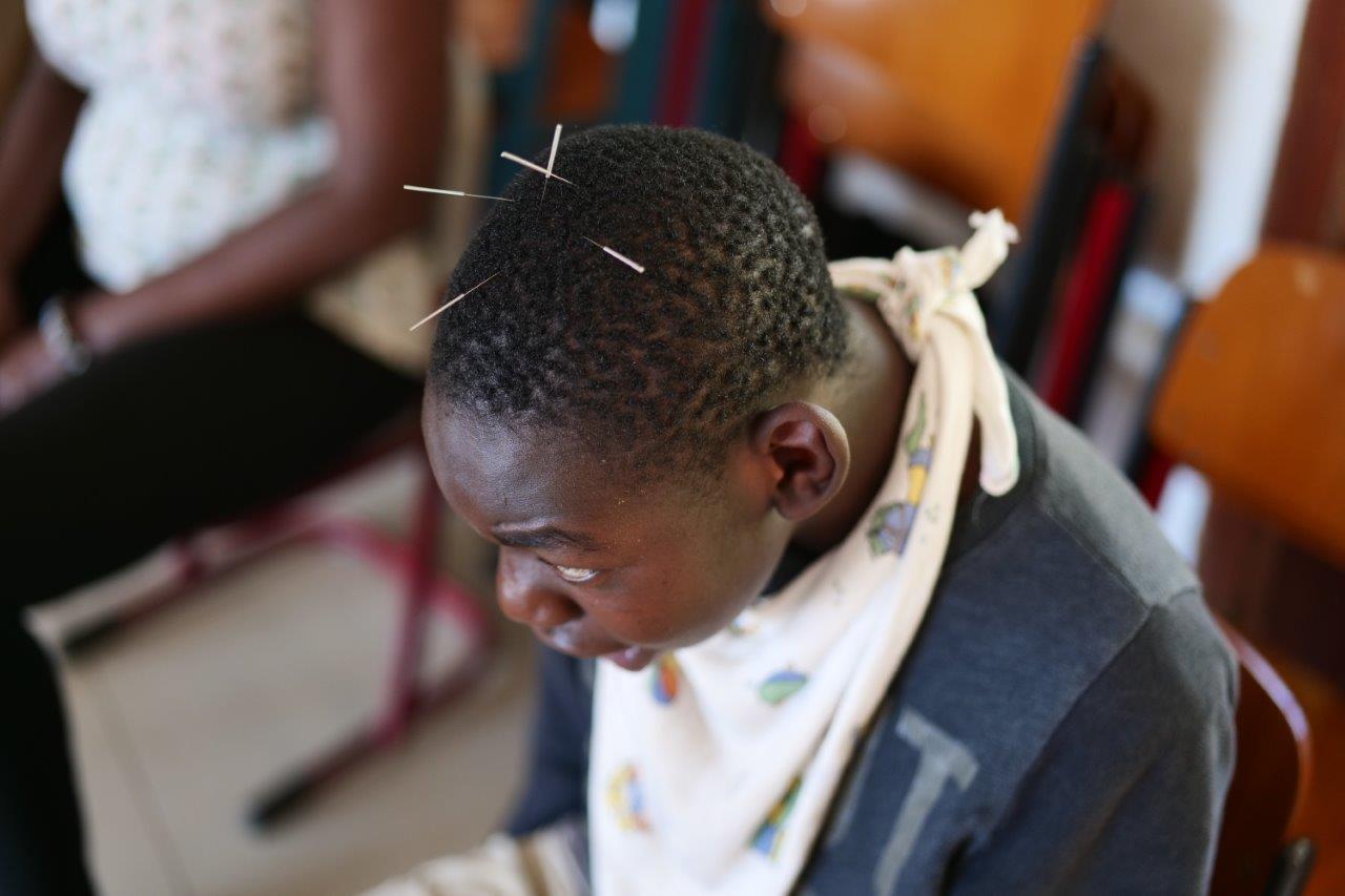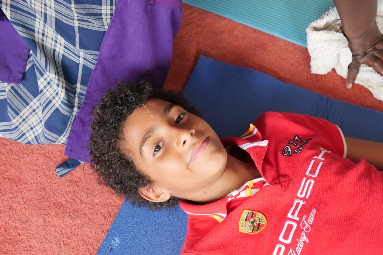 Am nächsten Tag ging es 15min. zu Fuss durch das Dorf zum Kinderdorf Nice View. Auch da wurden wir mit einem herzlichen Jambo begrüsst. Mit Gudrun haben wir besprochen wie wir die Behandlung der Kinder am besten durchführen können. Wir starteten am ersten Tag im Yogaraum mit den Kindern, die bettnässen. Sie legten sich alle nebeneinander auf Matten und wurden so einer nach dem anderen mit Akupunktur behandelt. Es war erstaunlich wie die Kinder sofort neugierig waren und super mitmachten. Am zweiten Tag kamen bereits mehr Kinder, auch mit anderen Problemen, wie Aufmerksamkeitsstörungen, Augenproblemen, Bauchschmerzen, Asthma, Kniebeschwerden und mit angeborenen Gebrechen. Ab dem dritten Tag kamen die Kinder bereits angerannt, wenn sie uns zum Tor reinkommen sahen und stritten sich wer als erstes dran kommt. Wir arbeiteten in Schichten, zuerst eine Gruppe Kinder auf den Matten, die Nadeln blieben rund 20min. drin für die Wirkung, dann die nächste Gruppe und so ging es weiter. Ab dem zweiten Tag lagen auch bereits die Mamas auf den Matten mit ihren Rückenschmerzen. Wir wollten am folgenden Tag jeweils wissen wie es allen ging – und obwohl ich bereits mehr als 20 Jahre mit Akupunktur arbeite – war ich immer wieder erstaunt über die Resultate. Es gab Kinder die nässen seit 13 Jahren ein und blieben plötzlich trocken, andere konnten sich besser konzentrieren, das Baby hatte weniger Bauchkrämpfe und schlief besser durch, die Bewegungsapparat Probleme verbesserten sich oder verschwanden ganz. Es war faszinierend zu sehen, wie die Kinder spürten, dass ihnen die Behandlung hilft und sie so super mitmachten, obwohl nicht jede gesetzte Nadel nur angenehm ist.