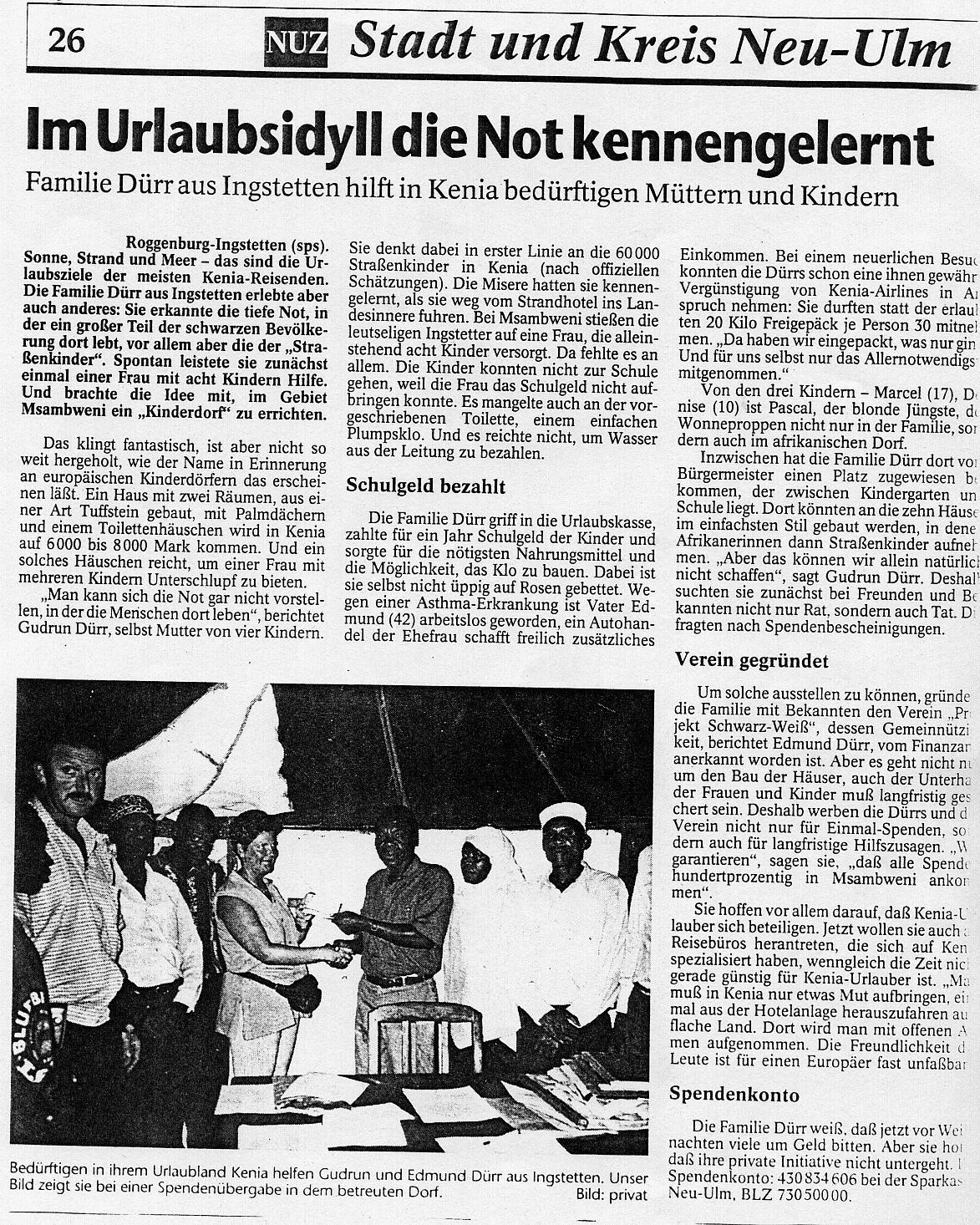 26. Februar 2018Sonne, Strand und Meer – das sind die Urlaubsziele der meisten Kenia-Reisenden. Die Familie Dürr aus Ingstetten erlebte aber auch anderes: Sie erkannte die Not, in der eine großer Teil der schwarzen Bevölkerung dort lebt, vor allem aber die der „Straßenkinder“. Spontan leistete sie zu nachäst einmal einer Frau mit acht Kindern Hilfe. Und brachte die Idee mit, im Gebiet Msambweni eine „Kinderdorf“ zu errichten.