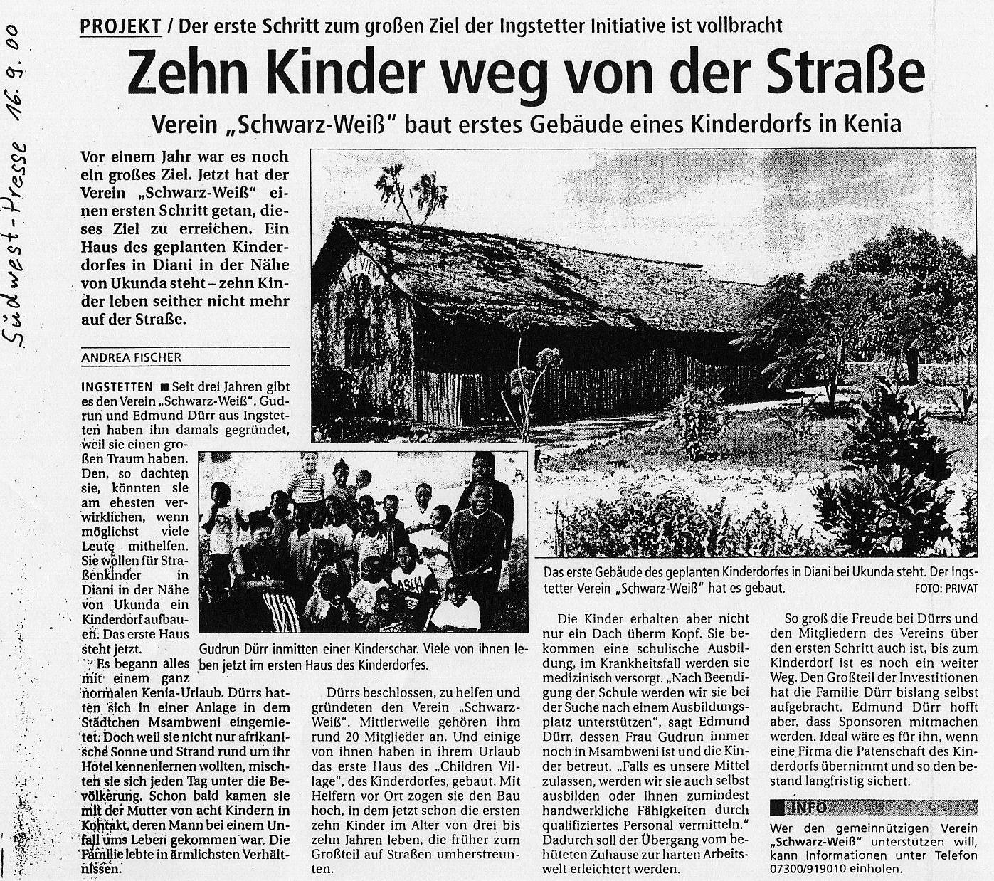 Vor einem Jahr war es noch ein großes Ziel. Jetzt hat der Verein „Schwarz-Weiß“ einen ersten Schritt getan, dieses Ziel zu ereichen. Ein Haus des geplanten Kinderdorfes in Diani in der Nähe von Urkunda steht – zehn Kinder leben seither nicht mehr auf der Straße.