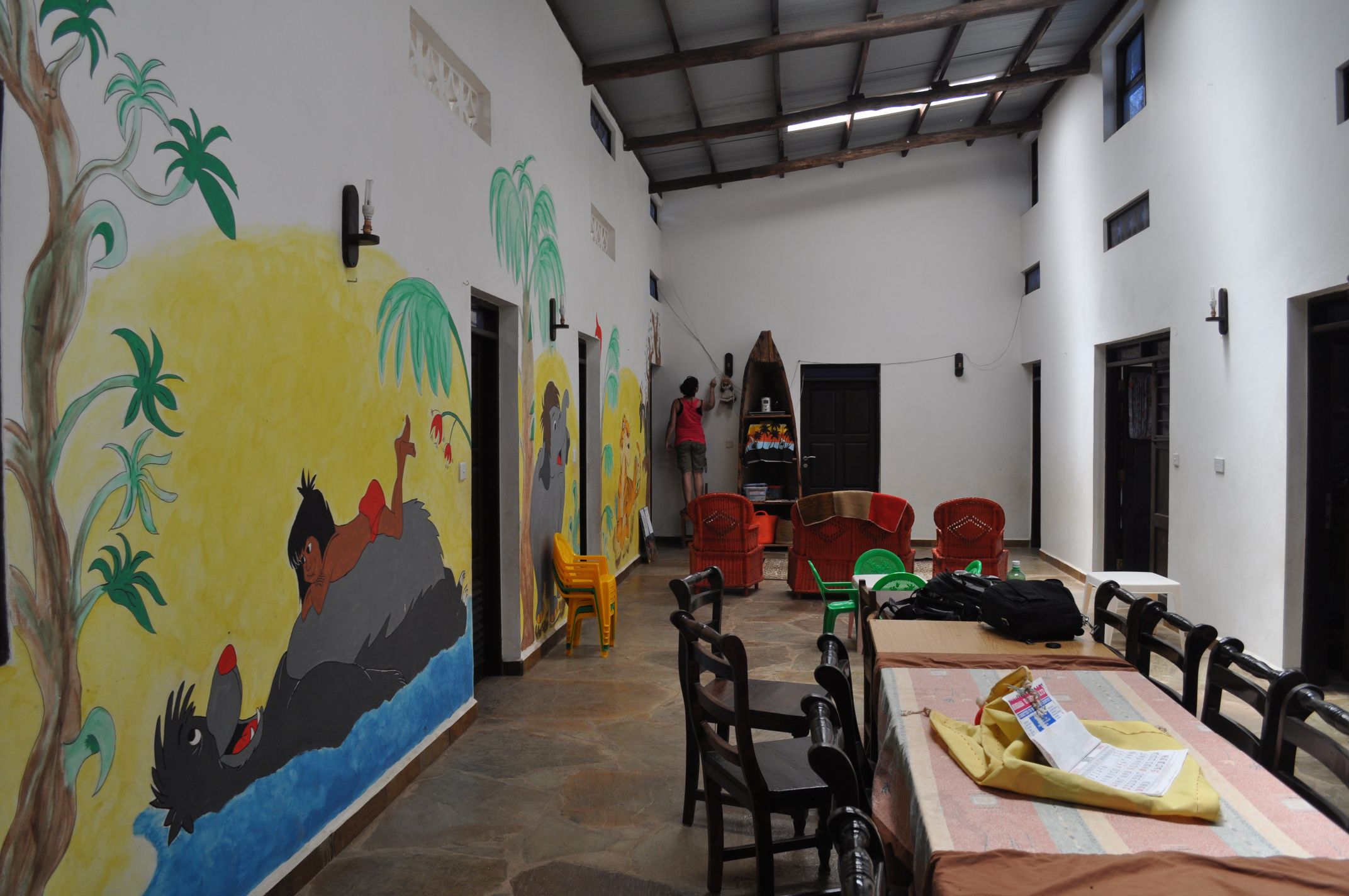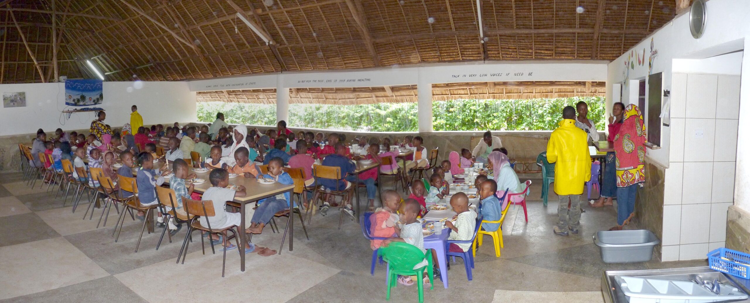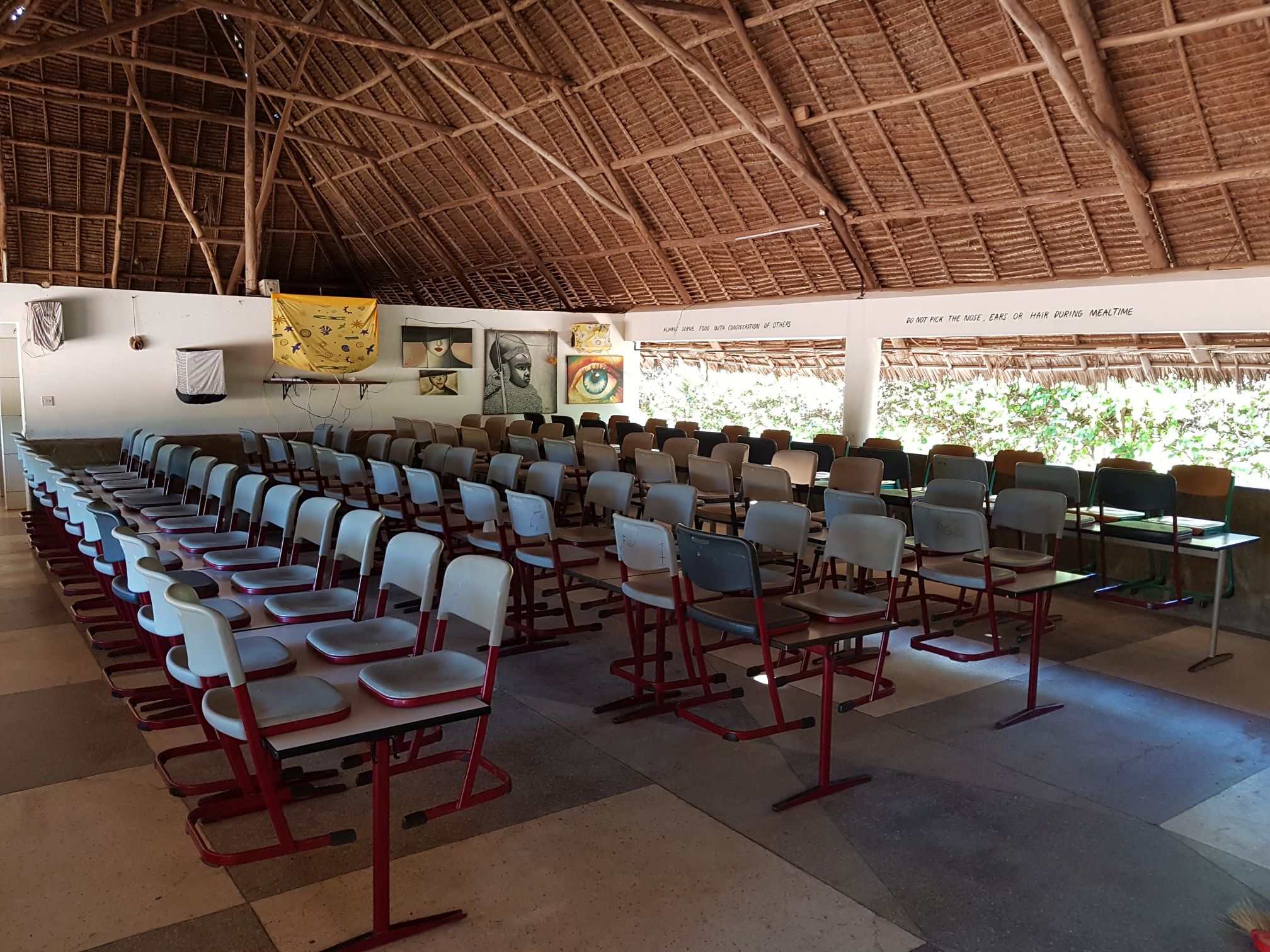 Im Gemeinschaftsraum kann man sich, wenn man möchte, stärken und beobachten, wie in der Hauptküche gekocht und das Essen serviert wird. Unter dem großen Makuti-Dach wird gemeinsam gegessen und am Wochenende oder in den Ferien schon auch mal Platz zum Tanzen oder andere Aktivitäten geschaffen.