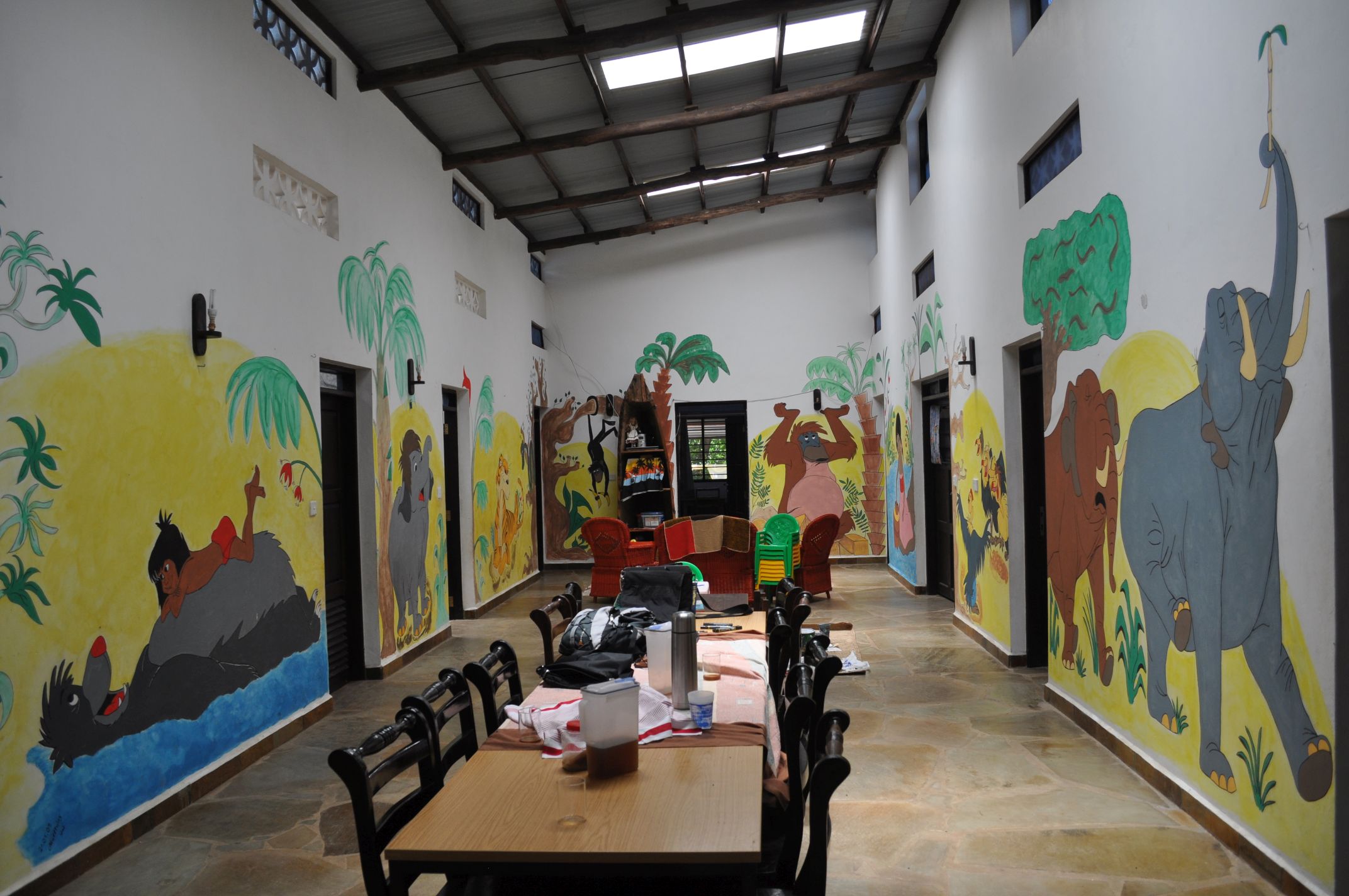 Im hellen Aufenthaltsraum wird man dann an den Wänden von Mowgli und seinen Freunden begrüßt. Man könnte am Tisch oder auf dem Sofa Platz nehmen.